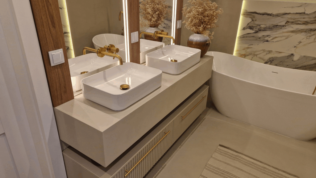 Mikrocement w łazience to nowoczesne rozwiązanie, które łączy estetykę z trwałością i wysoką odpornością na wilgoć. Dzięki uniwersalności i cienkiej warstwie można go stosować praktycznie wszędzie: na ścianach, podłogach, na blatach czy meblach – bez konieczności kucia starych płytek, również w strefach mokrych.