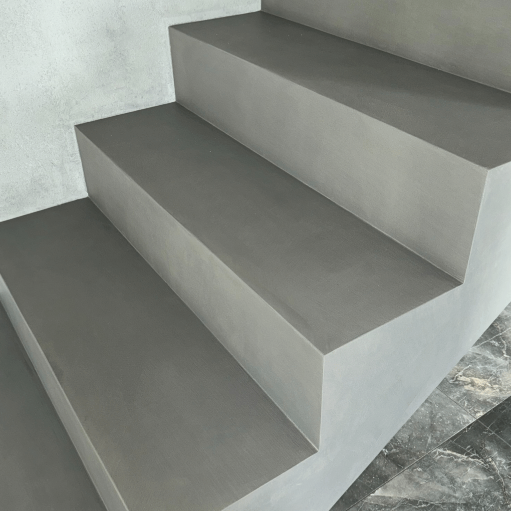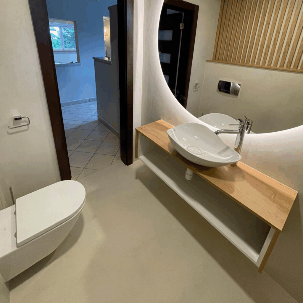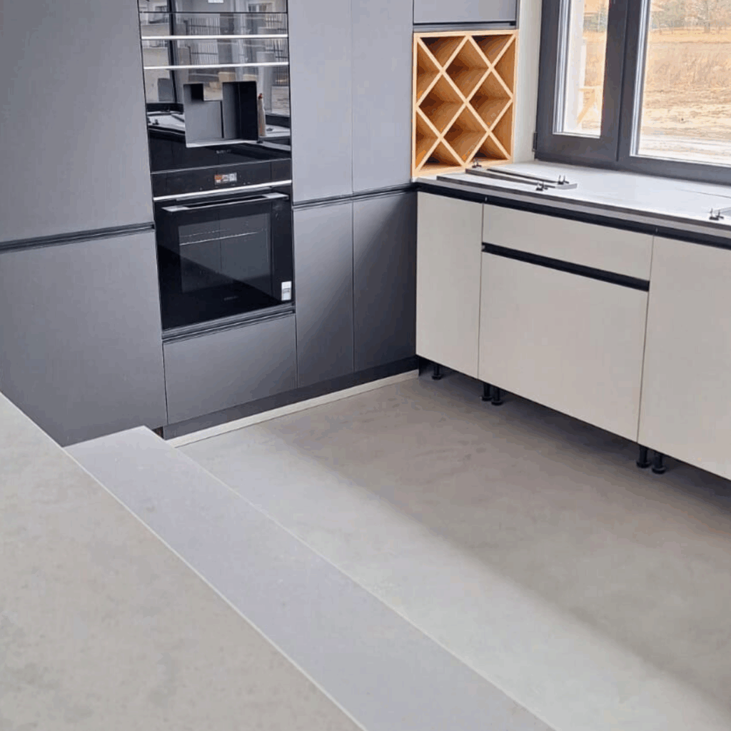 🔸Łazienki – podłogi i ściany, również w strefach mokrych (prysznic, okolice wanny), 🔸Kuchnie – podłogi, ściany, a także przestrzeń nad blatem kuchennym, 🔸Korytarze i przedpokoje – trwałe powierzchnie odporne na intensywne użytkowanie, 🔸Schody – jednolita i łatwa w utrzymaniu powierzchnia bez fug, 🔸Blaty i meble – nowoczesne, spójne wykończenia dopasowane do aranżacji wnętrza.