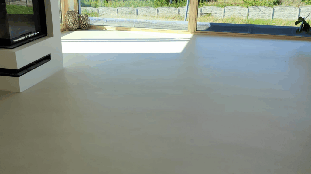 Beżowy mikrocement w systemie CONEPOX na podłodze w salonie