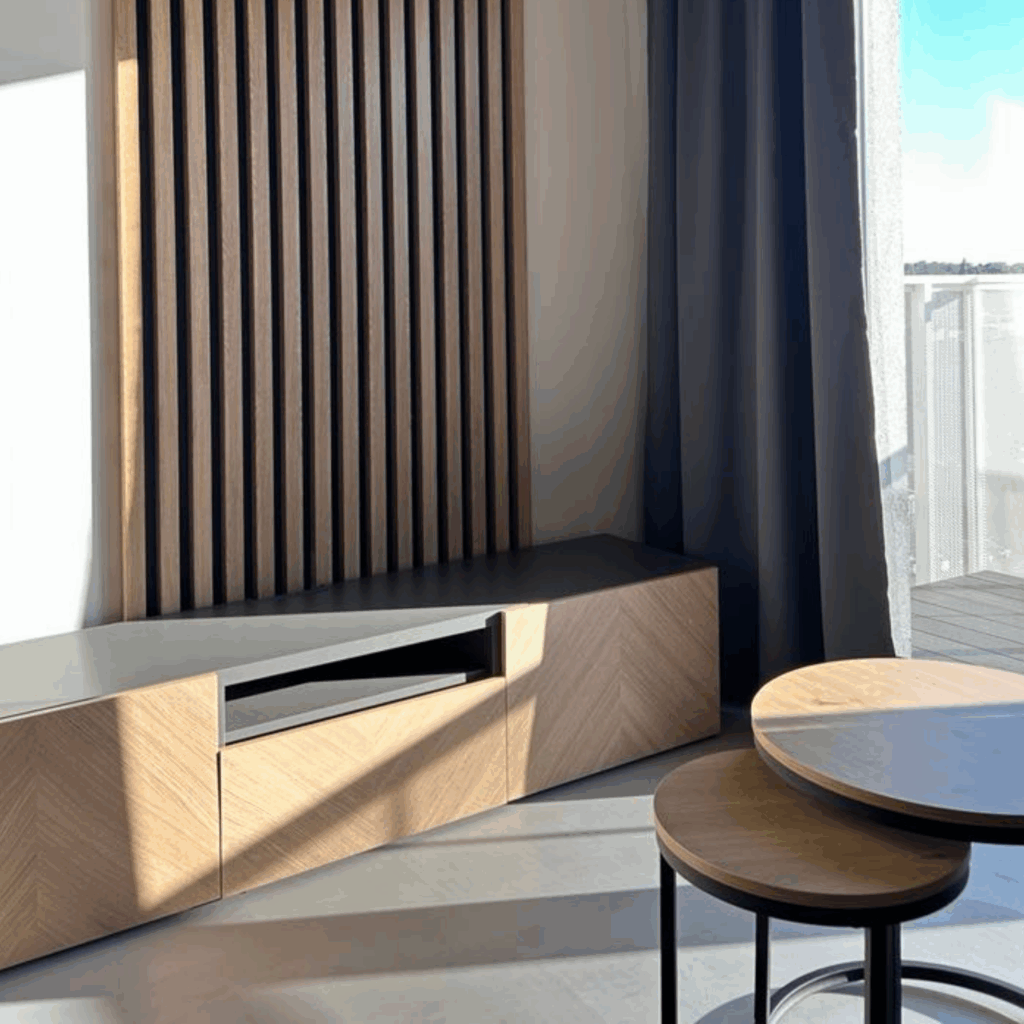 🪑 Meble, wyspy i zabudowy – pozwala wykonać spójne elementy – od mebli, przez podłogi, aż po ściany. W efekcie cała strefa dzienna zyskuje jednolity styl i spokojną kolorystykę.