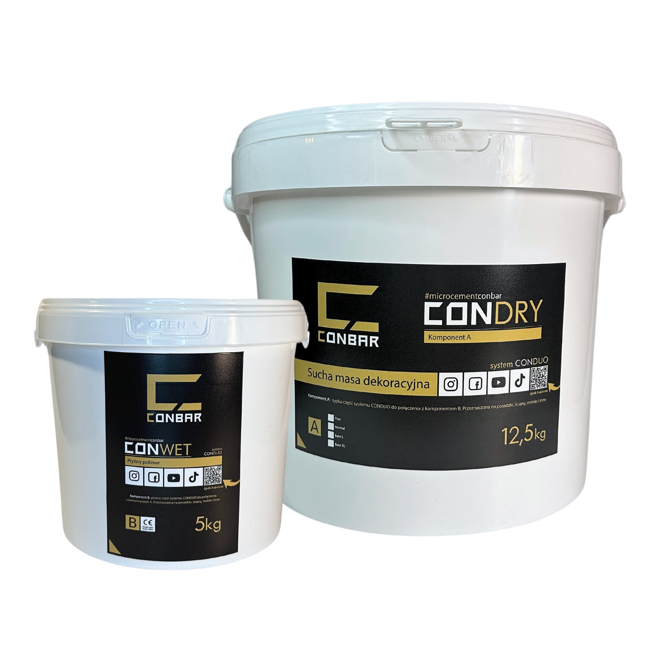 Płynny polimer CONWET przemieszaj, a następnie przelej do większego, pustego wiadra. Następnie dodaj pigment CONPIGMENT i wymieszaj. Kolejno suchą mieszankę CONDRY stopniowo dodawaj do mokrej części ciągle mieszając przez ok. 4 minuty, aż do uzyskania jednolitej konsystencji. Najlepiej jest użyć mieszadła koszyczkowego lub Mieszadła do mikrocementu. Stosunek wagowy CONDRY (składnik A: sucha masa dekoracyjna) do CONWET (składnik B: płynny polimer) = 2,5 do 1. Zmieszaj tyle mikrocementu, aby wystarczył na jedną warstwę. Powierzchnię do aplikacji mikrocementu zabezpiecz za pomocą Taśmy malarskiej, a ręce za pomocą rękawiczek np. Nitrylowych. Aplikować za pomocą Pacy weneckiej na grubość ziarna. Pobierz kartę techniczną, która znajduje się poniżej lub zeskanuj kod QR z etykiety opakowania aby dowiedzieć się więcej.