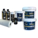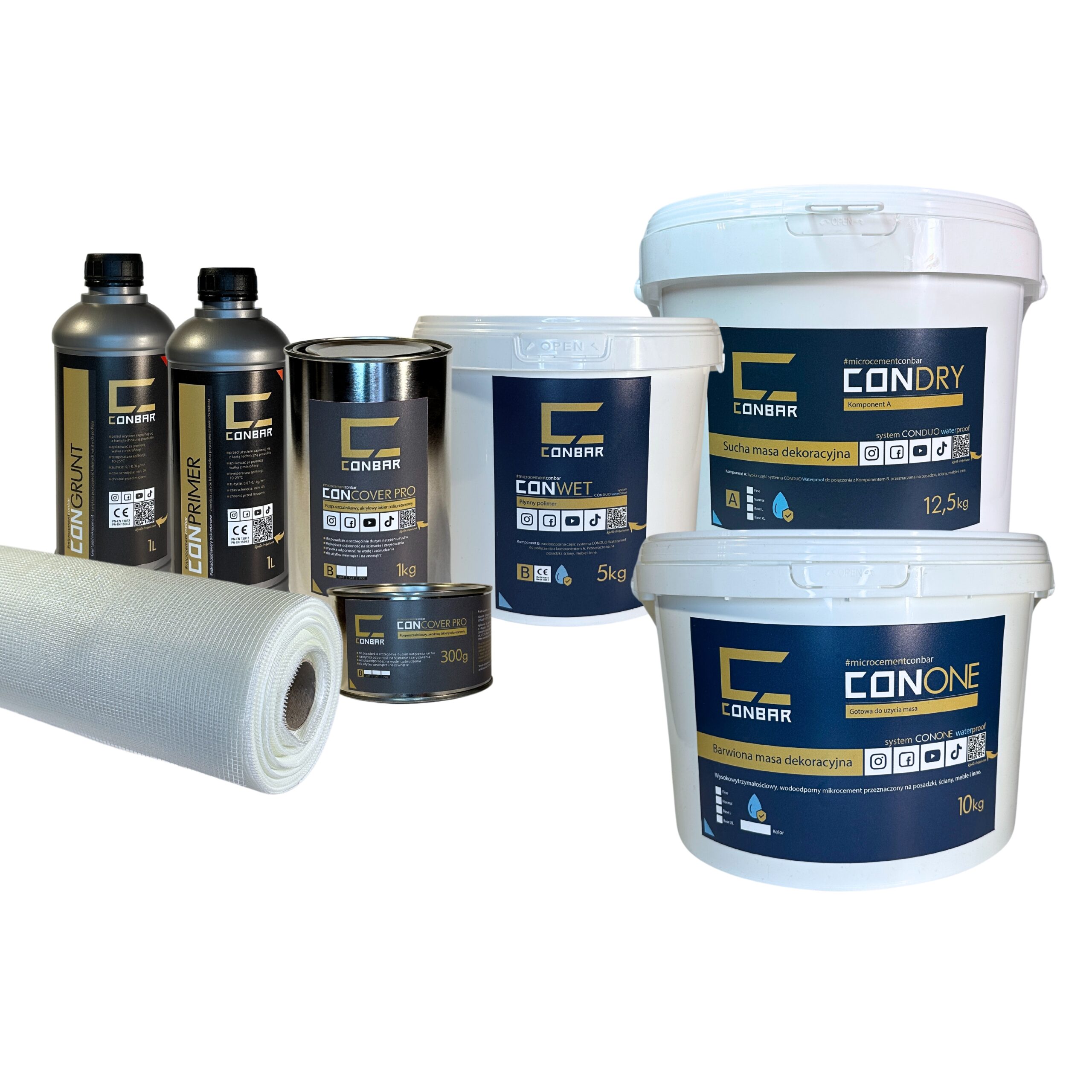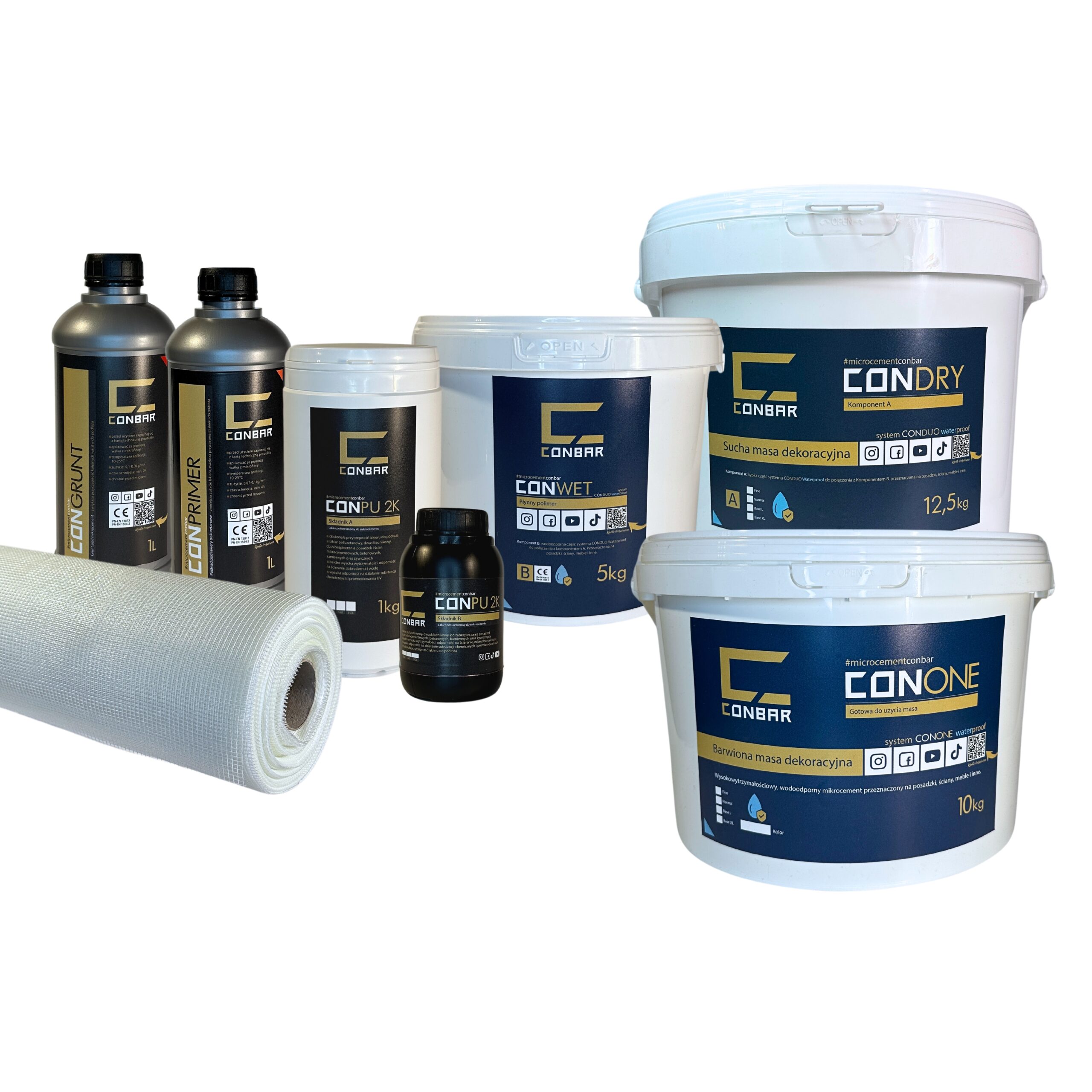 – CONDUO Waterproof Base L 17,5kg (CONDRY Waterproof Base L 12,5kg + CONWET Waterproof 5kg) – gruboziarnisty, dwuskładnikowy, wodoodporny w masie mikrocement, idealny do przykrycia siatki w strefach mokrych na ścianach