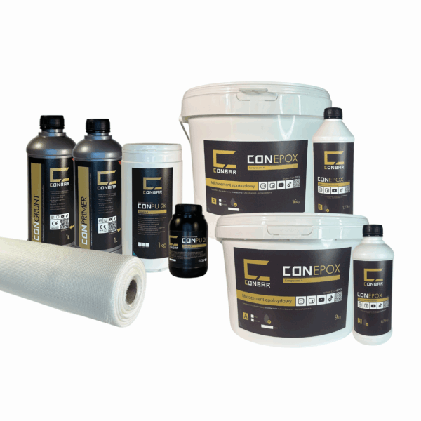 – CONEPOX Base L 10,35kg: gruboziarnisty, barwiony w masie mikrocement dwuskładnikowy na bazie żywicy epoksydowej, idealny do przykrycia siatki, jako przygotowanie podłoża pod mikrocement drobnoziarnisty