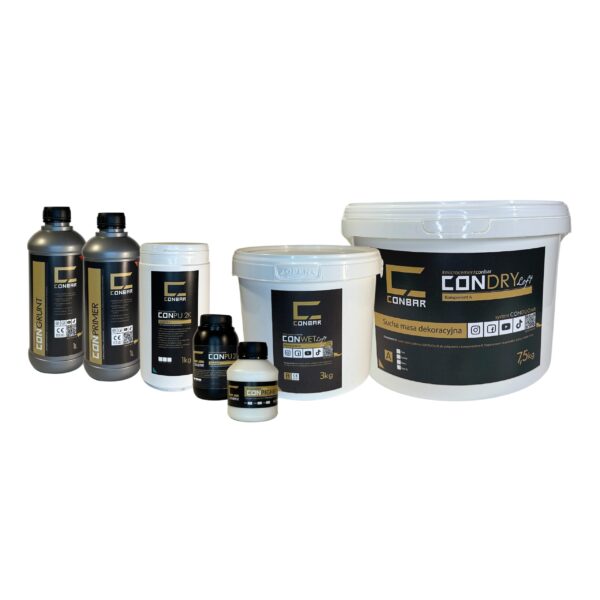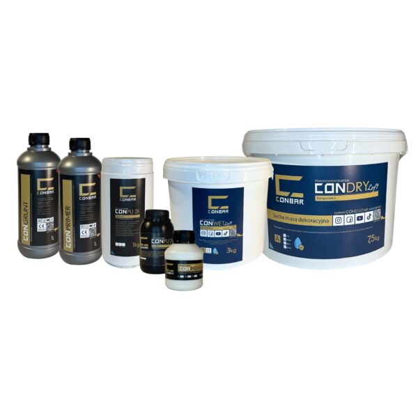 – CONDUO Loft Normal 10,5kg (opcjonalnie w wersji Waterproof) = CONDRY Loft Normal 7,5kg (opcjonalnie w wersji Waterproof) + CONWET Loft 3kg (opcjonalnie w wersji Waterproof): drobnoziarnisty, dwuskładnikowy, (opcjonalnie wodoodporny w masie) mikrocement, idealny na wierzchnie warstwy w strefach suchych lub mokrych w wersji Waterproof