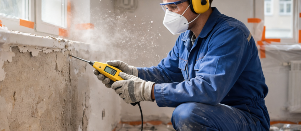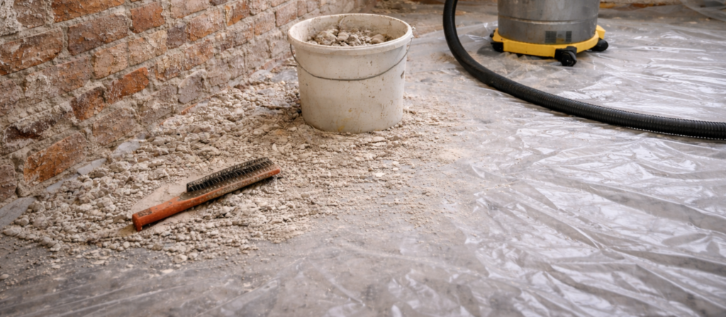 🔸Zraszaj wodą (cement) – wilgotny tynk pyli mniej i odspaja się łatwiej. Nie mocz tynków gipsowych.