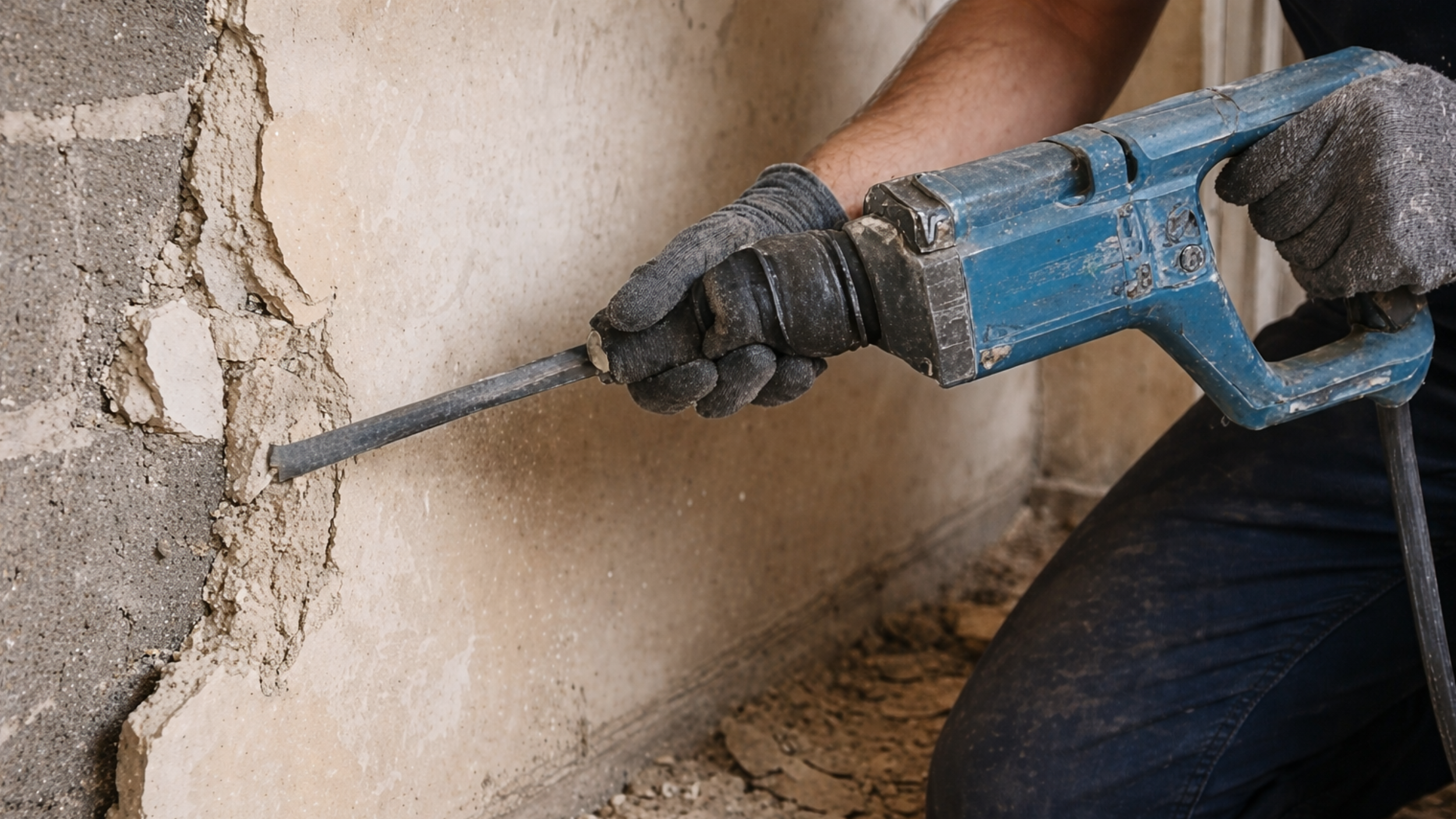 Wykorzystanie naturalnych pęknięć w tynku jako punktów startowych znacznie przyspiesza demontaż.