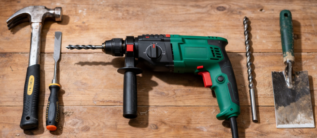 Młotowiertarka z uchwytem SDS+ to podstawowe elektronarzędzie do skuwania tynków na dużych powierzchniach ścian działowych i nośnych. Dla użytkownika amatorskiego kluczowa jest waga urządzenia – optymalny model powinien ważyć między 2,5 a 3,5 kg, co umożliwia dłuższą pracę bez nadmiernego zmęczenia ramion. Energia udaru powinna wynosić od 3 do 5 dżuli (J). Istotnym udogodnieniem jest system Vario-Lock, który pozwala zmienić kąt ustawienia dłuta bez obracania całego narzędzia, chroniąc nadgarstki przed nienaturalnym wykręceniem podczas pracy. Sprzęt klasy SDS Max (>10 J) jest przeznaczony do betonu i może być zbyt agresywny dla standardowych murów, powodując pękanie cegieł.